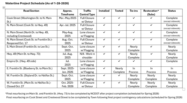 The updated schedule for the current project scope provided by the contractor shows completion of all main waterline installation by the end of January. Final tie-ins, line operation, restoration of impacted curb & gutter, sidewalk, disturbed ground cover will continue through February. The original contract timeline allowed for 450 days from project start date (February 10, 2025) for substantial completion, which is May 6, 2026. While the contractor had hoped for an accelerated timeline to have substantial completion by the end of 2025, it now appears that the project will have substantial completion by March 2026 with only punch list items remaining. This is still ahead of the contractual date of May 6, 2026. NCDOT has scheduled final resurfacing of Main Street and Franklin Street (Hwy. 73) for the spring. Town staff and contract engineers will be meeting with NCDOT soon to discuss the logistics and details of the planned resurfacing.