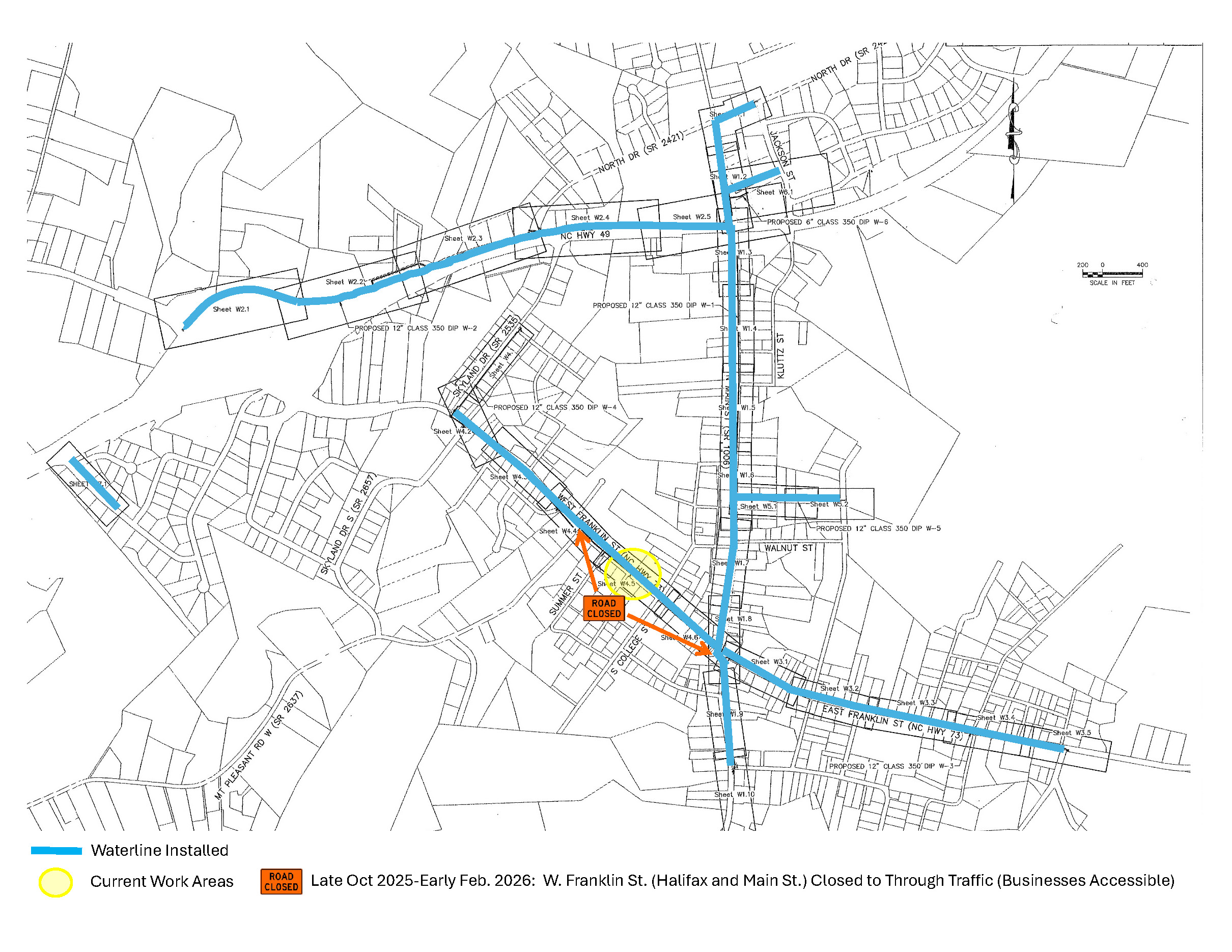 Waterline installation on W. Franklin Street between Halifax Street and Main Street is complete, pressure tested, and certified. During the week of January 19 crews completed service tie-ins for each customer along W. Franklin St. On January 29 and January 30, crews will be doing tie-ins for side streets at Halifax, Summer, Hillside, and College Streets. This will result in service interruptions on S. Halifax Street, Summer Street, Hillside Drive, New Street, Ludwig Street, Ridge Avenue, S. College Street and a portion of N. College Street for 3-5 hours for each of the four tie-ins. Weather permitting, the tie-ins for Skyland Drive, Page Street, and Eagle Street are scheduled for the first week of February, which will also result in service interruptions for customers located on those streets for 3-5 hours. Flowable fill was installed in the trench between Halifax Street and College Street. As required by NCDOT, the trench was filled ABC stone and fabric between College Street and Main Street. The winter weather delayed completion of asphalt patch. The contractor is waiting on temperatures above 40 degrees for a couple of days and for NCDOT to authorize completion of the asphalt patch. As soon as this is done, the road can be reopened.
