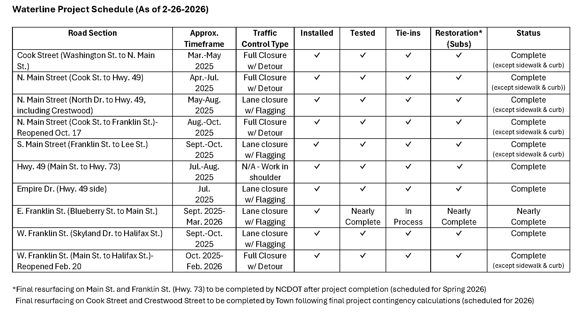 All main waterline installation was complete by the end of January 2026. Final tie-ins, line operation, restoration of impacted curb & gutter, sidewalk, disturbed ground cover will continue through the end of March. The original contract timeline allowed for 450 days from project start date (February 10, 2025) for substantial completion, which is May 6, 2026. While the contractor had hoped for an accelerated timeline to have substantial completion by the end of 2025, it now appears that the project will have substantial completion by March 2026 with only punch list items remaining. This is still ahead of the contractual date of May 6, 2026. NCDOT has scheduled final resurfacing of Main Street and Franklin Street (Hwy. 73) for the spring. Town staff and contract engineers will be meeting with NCDOT to discuss the logistics and details of the planned resurfacing.