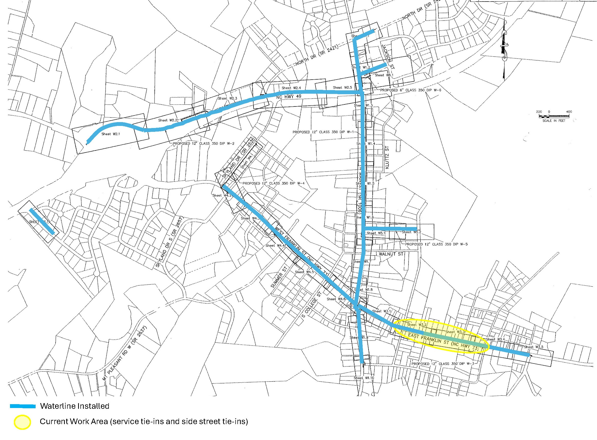 On W. Franklin Street between N. Skyland Drive and Main Street, waterline installation, pressure testing, certification, and tie-ins are complete, and the line is active. Flowable fill/ABC Stone and asphalt patch are complete. The road reopened on February 20. Final restoration of impacted sidewalk, curb, and pavement will be completed in March.