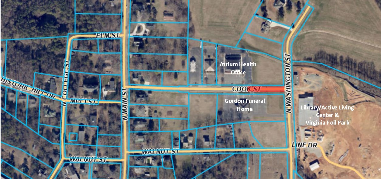 During the week of February 24, 2025, utility contractors will close the eastern end of Cook Street at the intersection of N. Washington Street to start work on the Town's waterline project. Cook Street will be reopened by the end of the week (Feb. 28). This work was postponed from the week of February 11, due to rainy weather. The Atrium Health Office and Gordon's Funeral Home can be accessed on Cook Street coming from N. Main Street. The Library/Active Living Center & Virginia Foil Park can be accessed from N. Washington Street coming from E. Franklin Street (Hwy. 73).