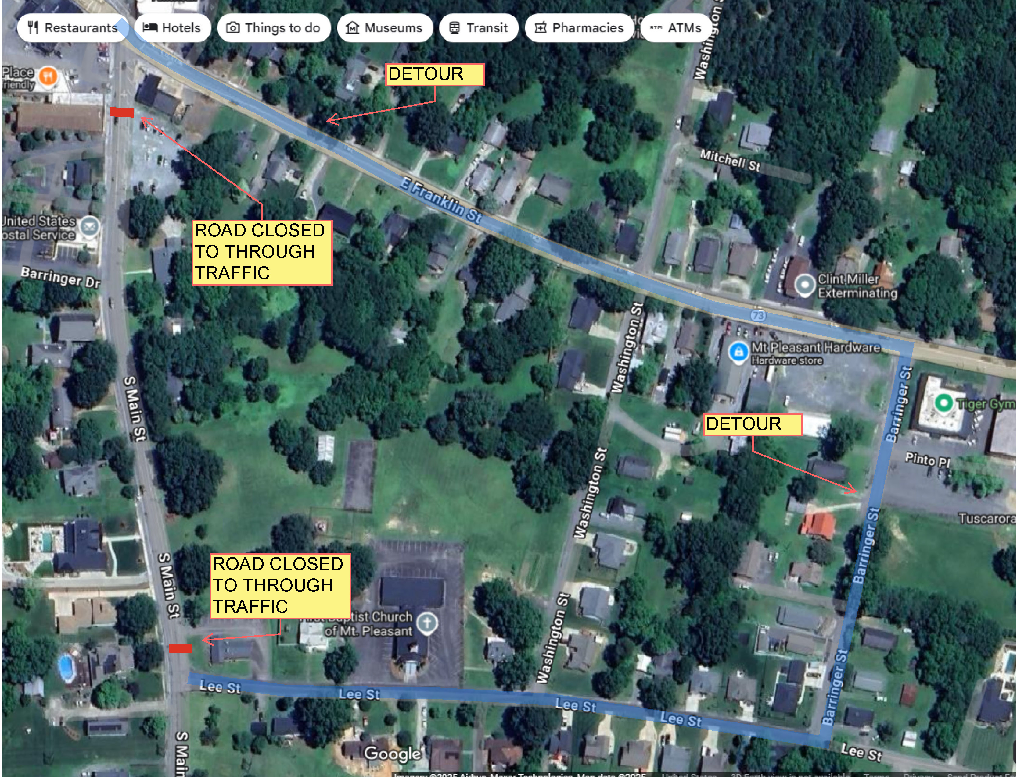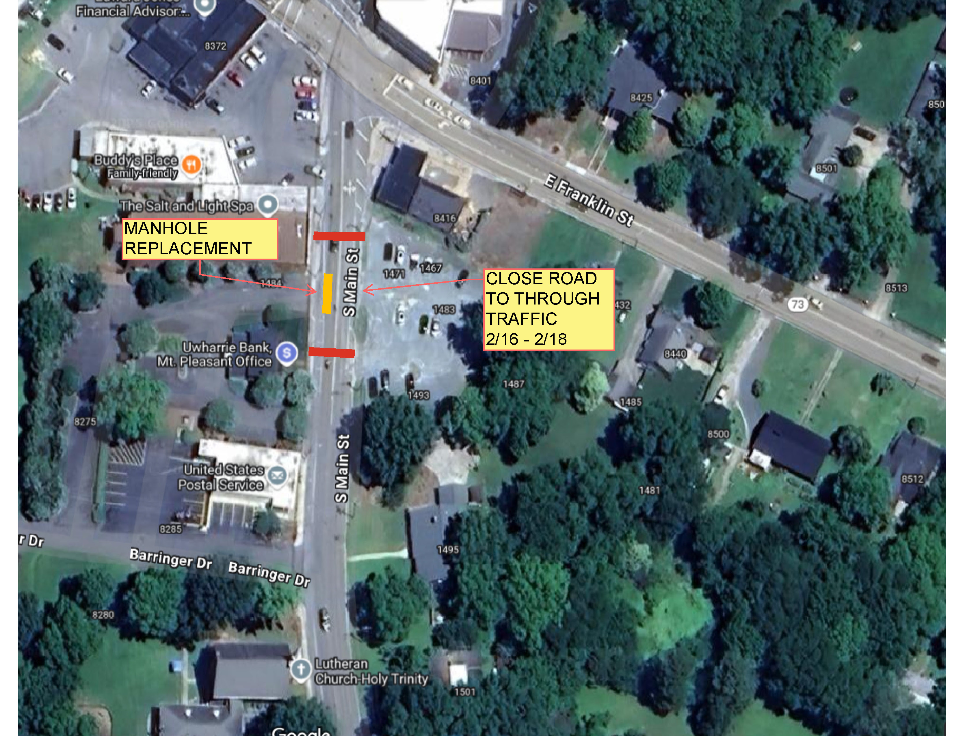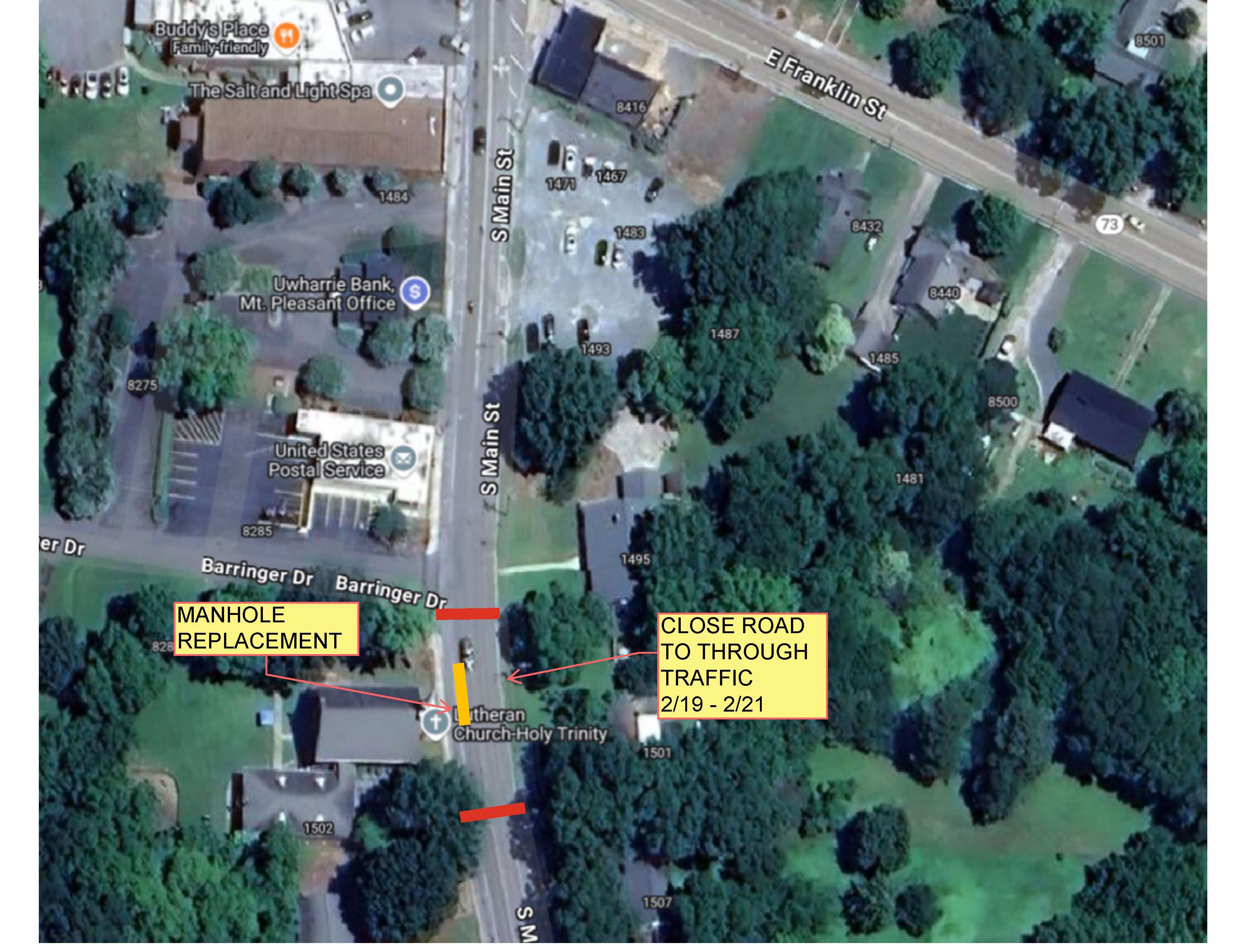 Beginning Sunday, February 16 through Friday, February 21, utility contractors will be working to replace four sewer manholes on S. Main Street between Franklin Street and Lee Street. The street will be open to local traffic, except the area where the work is taking place. Those conducting business at the Post Office or Uwharrie Bank are encouraged to use the driveways on Barringer Drive. The work between Buddy's Place and Uwharrie Bank will take place Sunday, February 16 through Tuesday, February 18. Buddy's Place will be closed on Monday, February 17 to facilitate the work. The work between Barringer Drive and the Lutheran Church of the Holy Trinity will take place Wednesday, February 19 to Friday, February 21.