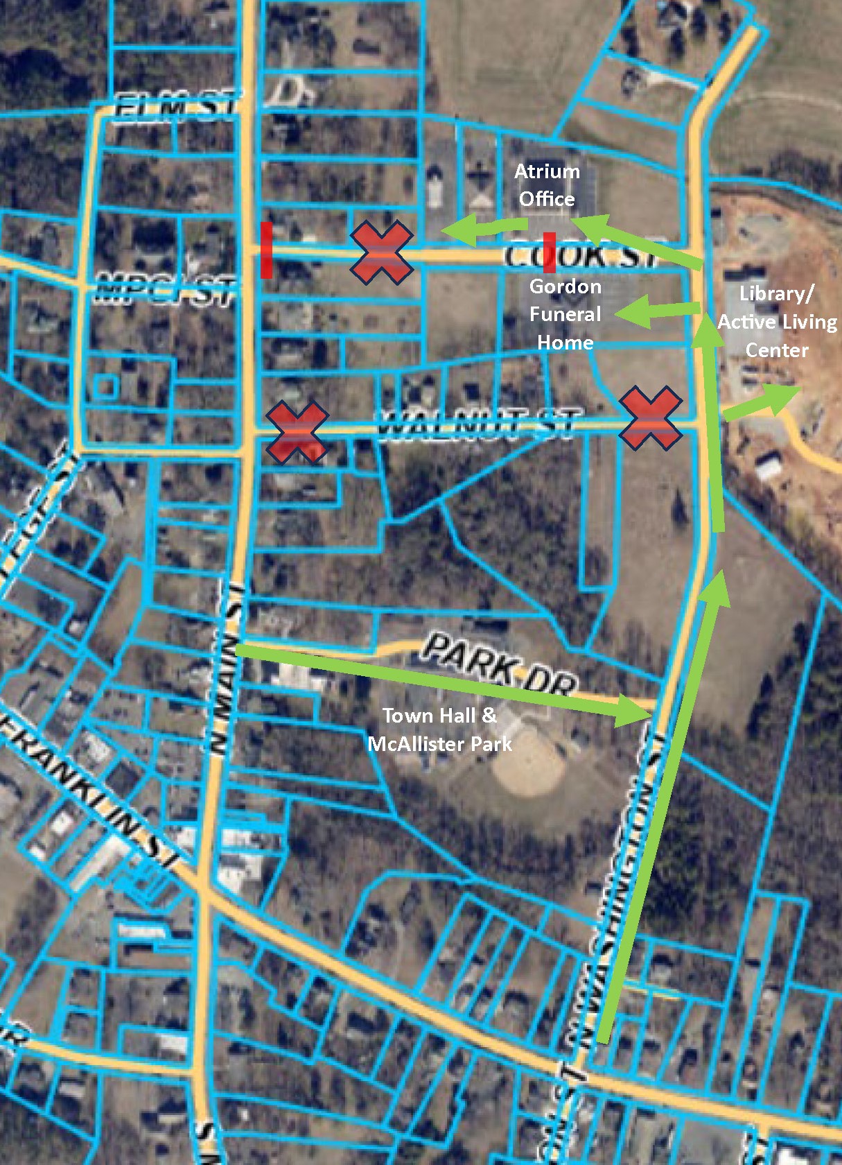 The waterline tie-in at the intersection of Cook Street and N. Washington Street has been completed. Utility crews are now working on laying the new waterline along Cook Street from N. Washington Street to N. Main Street. Beginning Thursday, March 13 Cook Street will be closed from N. Main Street to the Gordon Funeral Home and Atrium-Cabarrus Family Medicine driveways (see map below). All vehicles must access Gordon's Funeral Home, the Atrium-Cabarrus Family Medicine Office, and Zeba's Tax Service from the N. Washington Street end of Cook Street. Cook Street and Walnut Street are closed to through traffic. The Cabarrus County Library/Active Living Center/Virginia Foil Park facility can be accessed from N. Washington Street. Please do not use Walnut Street as a cut through. Through traffic is not permitted on Walnut Street due to its narrow width, and signs are posted on each end of Walnut Street. Park Drive and N. Washington Street may be used.