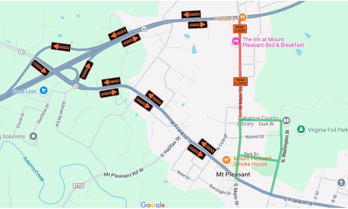 Beginning April 2, North Main Street will be closed from Highway 49 to Cook Street for the Town's waterline replacement project. This section of North Main Street will be closed to through traffic for approximately 2 months as crews replace the lines. Access will be maintained for local traffic only to residences on N. Main Street. Mail, garbage collection, and yard debris collection will still be able to access residences on their regular schedule, but delays may occur. Emergency services and Cabarrus County Schools are also being notified. The official detour utilizes Highway 49 and Highway 73/Franklin St (see map below). Cook Street, Park Dr., and N. Washington St. may also be utilized for local traffic and those accessing businesses and facilities on Cook Street and N. Washington St. Detour signage will be in place. Utility contractors are replacing old 6-inch cast iron pipe with new 12-inch lines.