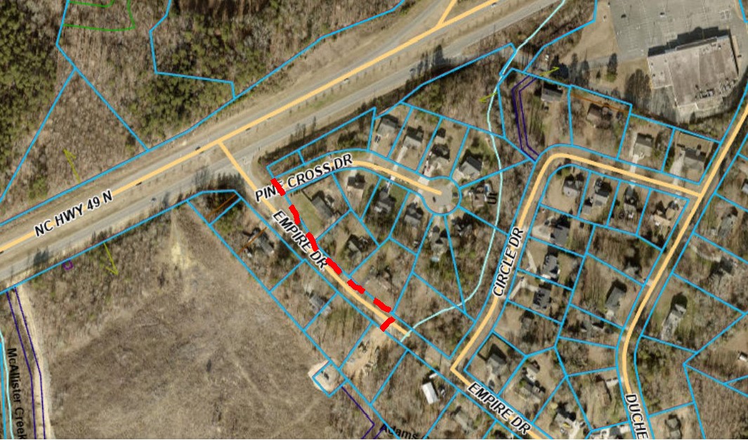 Contractors had originally scheduled the installation of a waterline on Empire Drive (Hwy. 49 side) during the weeks of June 9 and June 16. This work was postponed until additional progress is made on the main waterlines on Main Street and Highway 49. Installation on Empire Drive began the week of July 14. The waterline will be located outside of the travel lanes and within the street right-of-way on the north side of the street (map below). Residents along this section of Empire Drive have been contacted. Please contact Town Hall at 704-436-9800 if you have any questions.