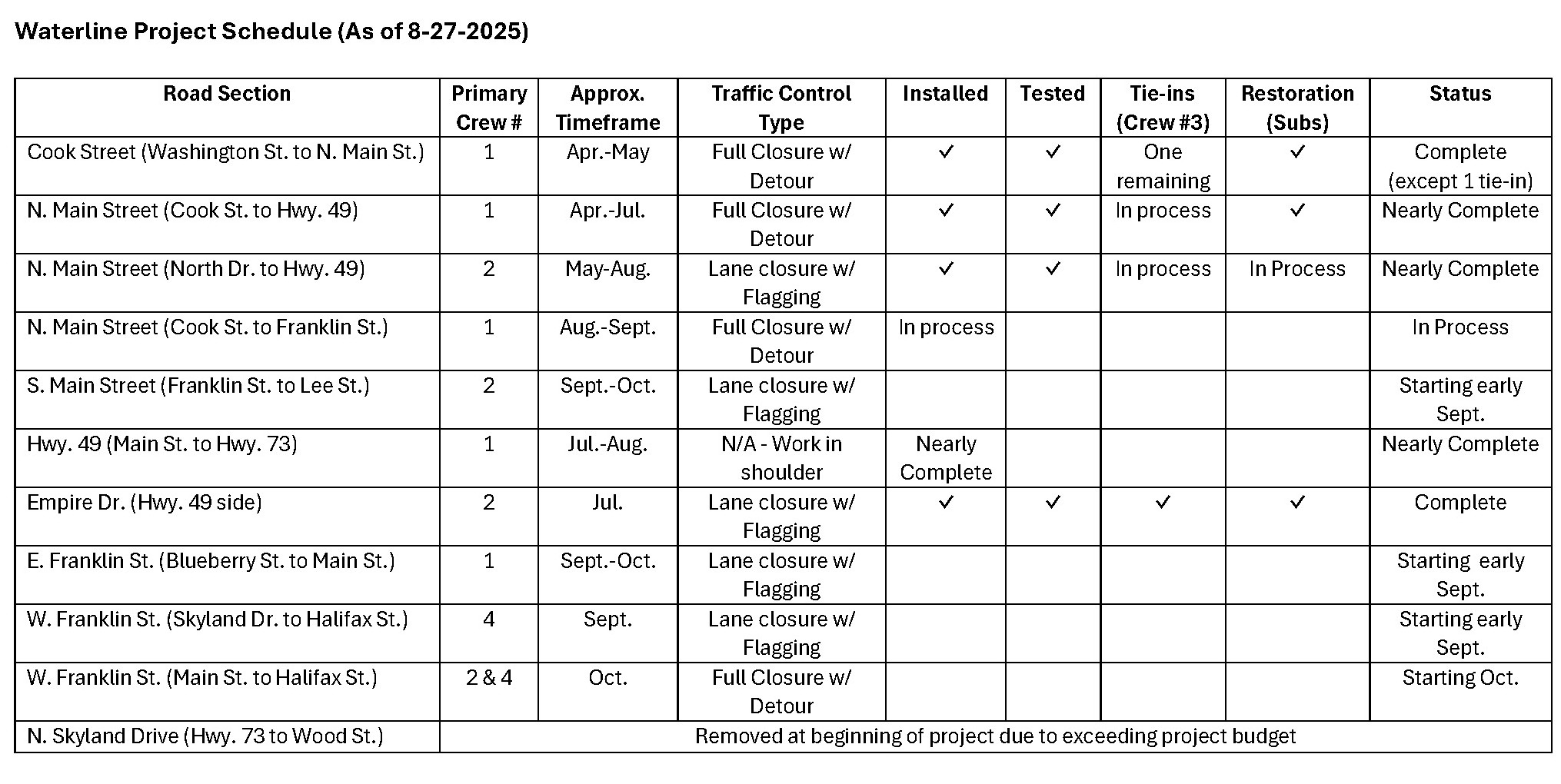 As discussed in the July 30 project update, crews began to install the waterline along N. Main Street between Cook Street and Franklin St. (Hwy. 73). In early September, the open cut across Highway 73 will take place utilizing lane closures and flagging with plates placed over the trench when work is not occurring. This will be followed by an open cut across S. Main Street at the square utilizing the same method. The new waterline will continue down to Lee Street with lane closures and flagging throughout September. The full length of N. Main Street should be reopened before the end of September.