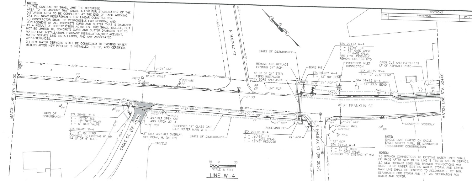 In October, W. Franklin Street between Main Street and S. Halifax Street will be closed to through traffic with a detour put in place utilizing Main Street (which will be reopened). The closure is being required by NCDOT due to roadway width and waterline location. Two crews will be working inward from S. Halifax and Main Street simultaneously to expedite the completion of this section and reduce the time of the closure. Access to businesses and residents will be maintained, while through traffic is detoured.